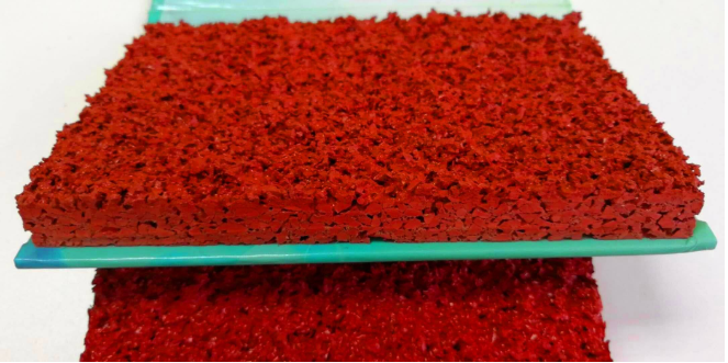 13mm透氣式塑膠跑道鋪設(shè)施工工藝是采用兩步施工法進(jìn)行鋪設(shè)的。底層黑膠粒層,攤鋪厚度為10-11毫米,將其固化后,在上面再噴涂厚度為2-3毫米的膠粒。
